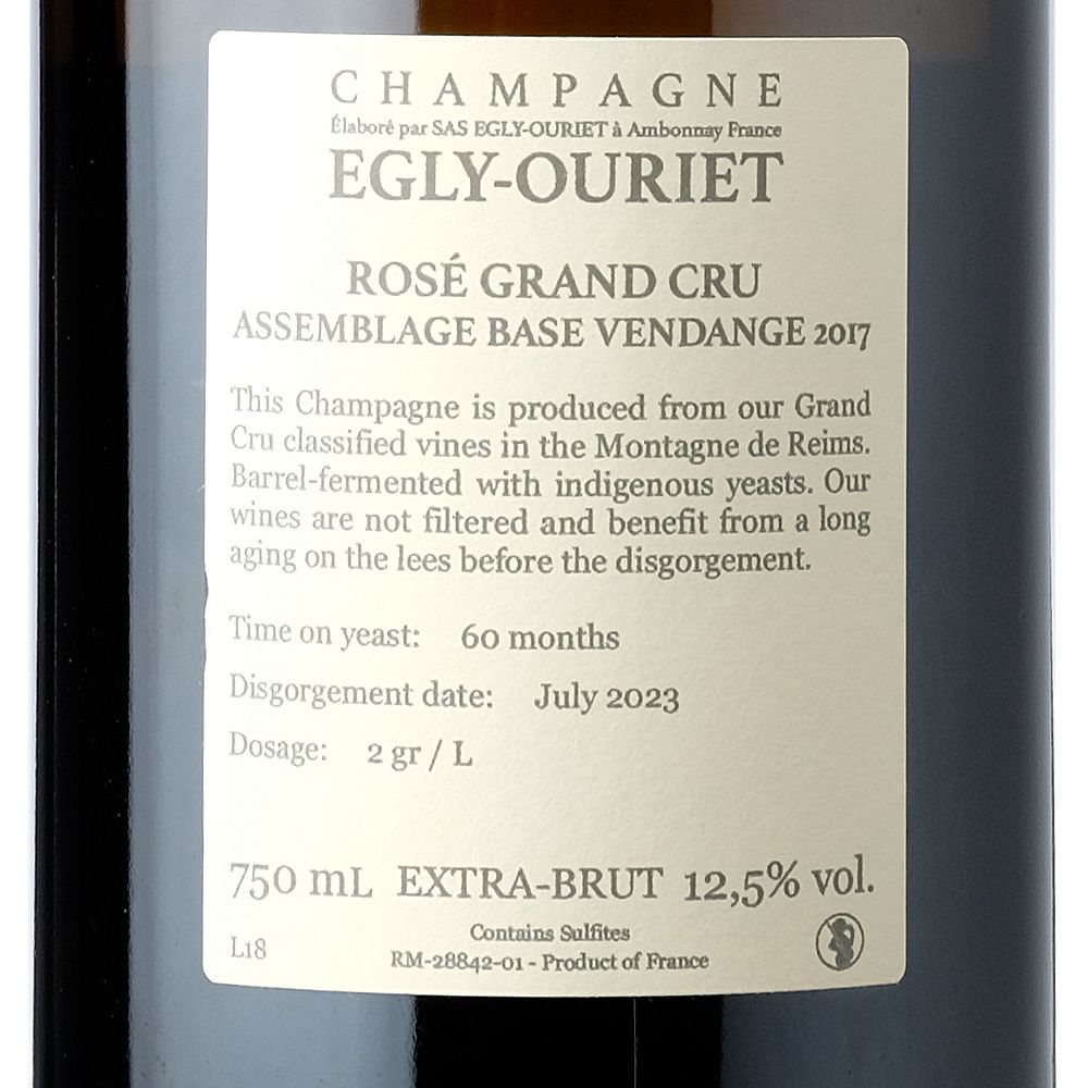 Egly-Ouriet Rosé Grand Cru Extra Brut es un refinado champán espumoso elaborado con uvas Chardonnay y Pinot Noir en la AOC Champagne, Francia. Egly-Ouriet, ubicada en 11.7 hectáreas repartidas entre Ambonnay y la Montaña de Reims, incluyendo la prestigiosa región de Bouzy, es reconocida como una de las líderes en la producción de Champagne.