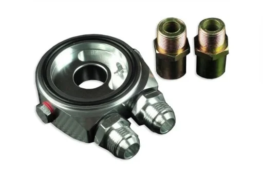 Un adaptador de filtro de aceite con termostato y salidas para el radiador de aceite. Fabricado en aluminio en máquinas CNC que garantiza la más alta calidad de mano de obra. Esencial para autos deportivos, especialmente en carreras callejeras: proporciona una temperatura óptima para una conducción equilibrada y de alta velocidad.