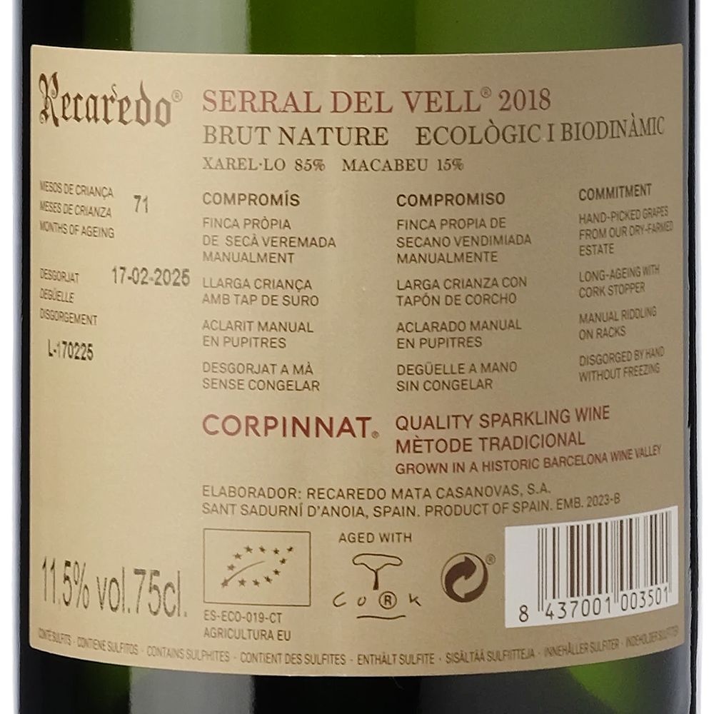 El Recaredo Serral del Vell Brut Nature 2018 es un vino espumoso elaborado con 85% Xarel·lo y 15% Macabeu por la bodega Recaredo en Corpinnat (Penedès). Desde 1924, Josep Mata Capellades dejó su legado en cerámica para sumergirse en el fascinante mundo de los espumosos de calidad en Sant Sadurní d’Anoia, su lugar de origen. Este cambio de oficio dio inicio a un proyecto que ha encantado a tres generaciones de su familia hasta hoy.